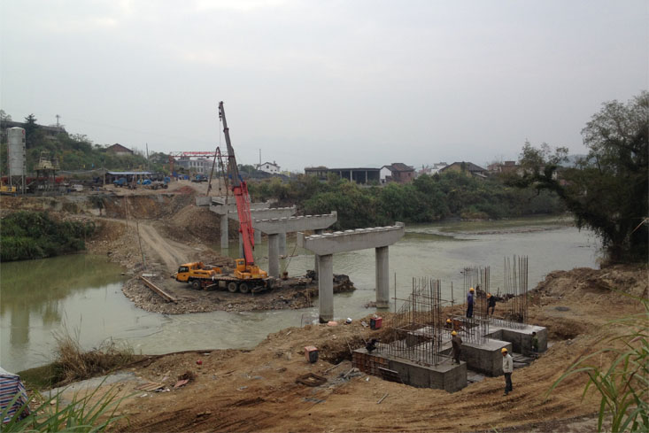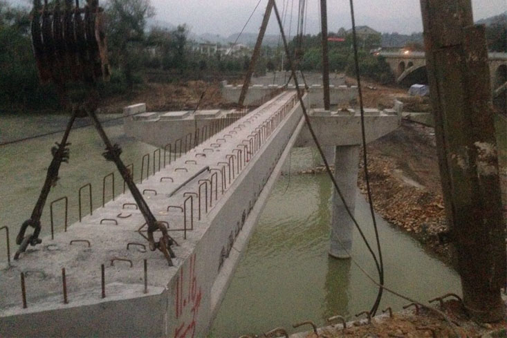 下午16時30分,公司下屬機械分公司副經理朱超群、該項目部經理汪承亮下達開始架梁的命令?,F場頓時掌聲雷動,禮花飛舞。在雙滑輪組的勻速滑輪中,空心板梁被緩緩推送到位,徐徐降落固定,經過近40分鐘的精心操作,S347炎陵石潮至壟下公路新河漠大橋4#-5#墩5-3#空心板中梁順利架設成功。