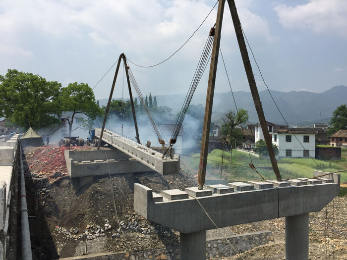 4月12日中午12時,位于炎陵縣S347項目新河西大橋建設現(xiàn)場,人字扒桿將一片長20米、重30.6噸的空心板梁從運梁車起吊,在參建人員的歡呼聲和鞭炮聲中,第一片空心板梁歷時5小時后平穩(wěn)、安全地安裝在支座上,成功架設。